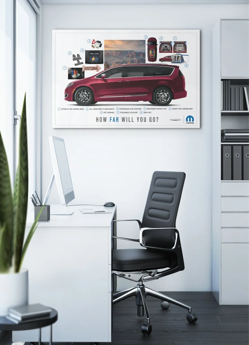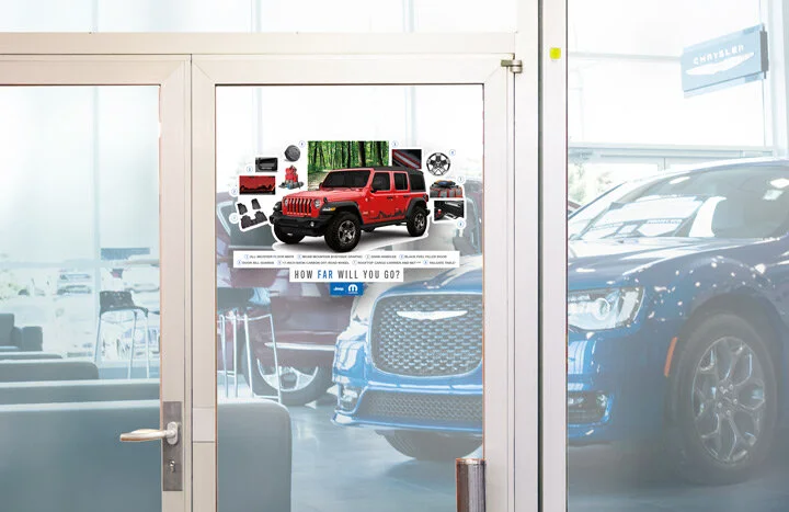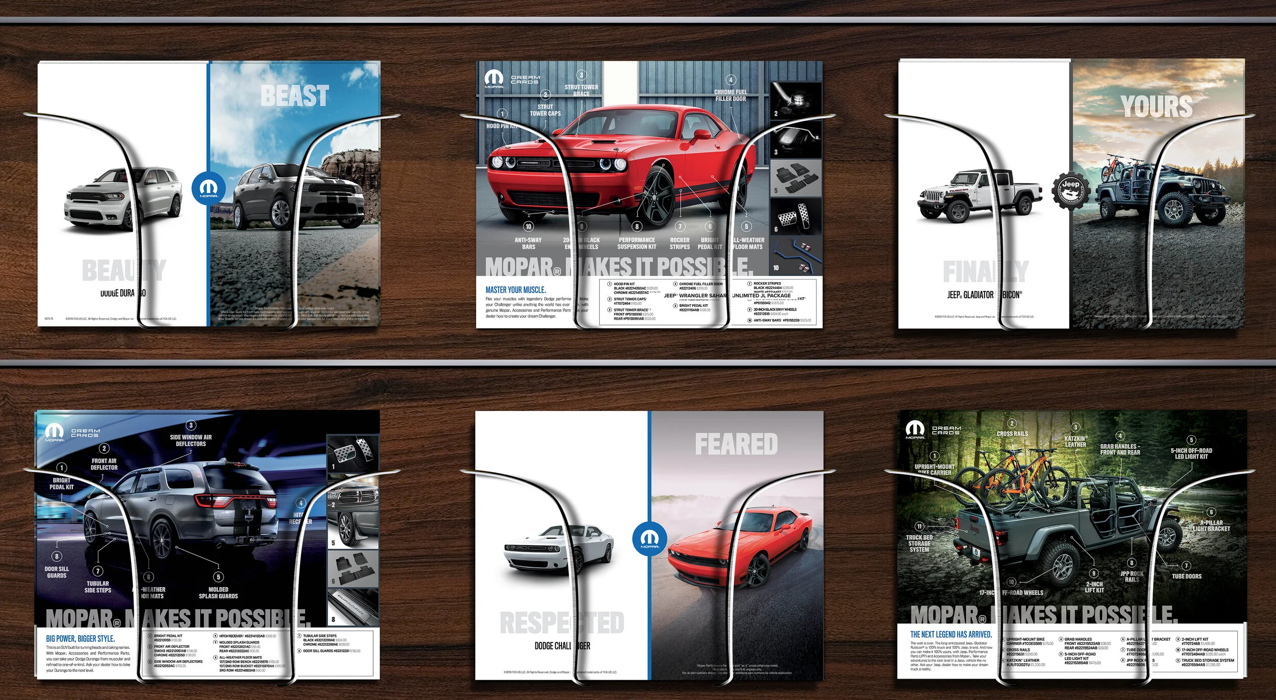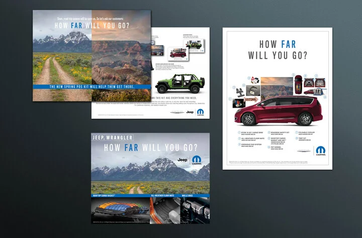 Previous iterations of Mopar’s Point of Sale Kits (POS) did little to showcase their extensive part library. By imagining these pieces, we were able to produce more engagement with the local dealerships. Each quarter our “How Far Will You Go?” campaign highlighted 2 new vehicles and their available aftermarket parts. This new theme line had the double meaning of how far you will go in distance with your road-trip as well as how far you would go to customize and make your FCA vehicle your own.